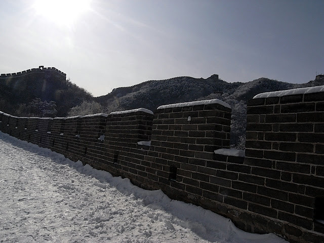雖然長城在外郊, 但交通也頗方便的. 愛舒適的我倆就選了搭長城和諧號火車, 車程大概是個多小時. 抵達八達嶺站, 由於昨晚下了入冬以來第一場大雪, 所以周圍都白雪雪的...