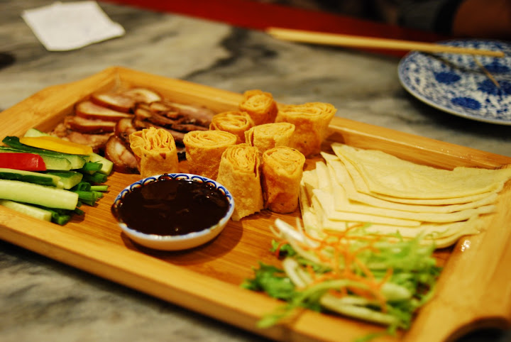 忘記了名字的小吃. 左邊的肉有點似日式叉燒. 中間的是脆的, 用右邊的皮包著, 再點中間那像北京填鴨的汁來吃.